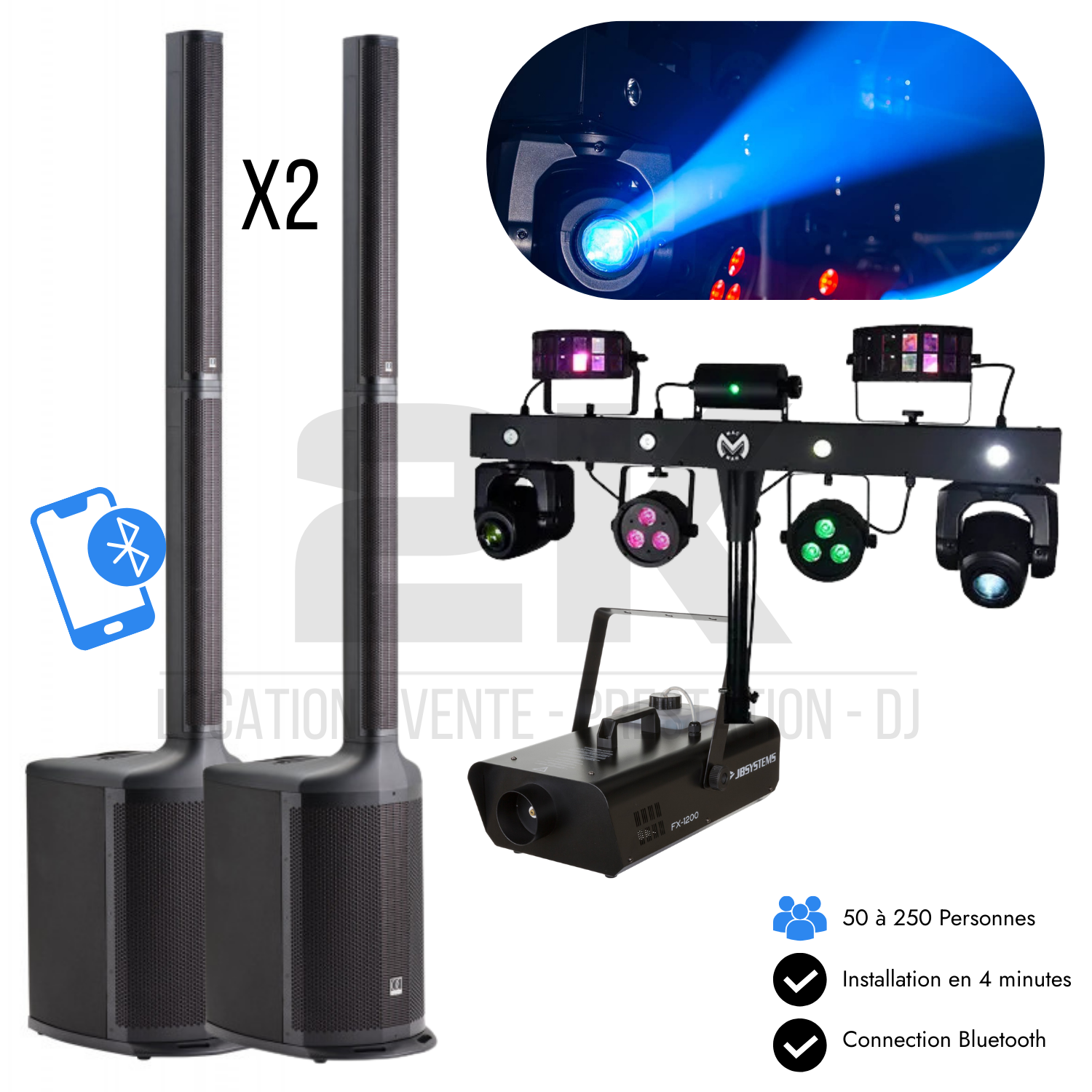 2x Audiophony MOJO 2000 LIVE + Machine à fumée JB Systems FX-1200 + Mac Mah – Moving-FX Bar